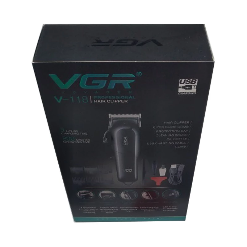 ماشین اصلاح وی جی ار مدل 118 یکی از ماشین های اصلاح بسیار عالی و با کیفیت برای استفاده خانگی و یا حتی سالن میباشد. این مدل دارای طراحی زیبا و خوش دستی است که از استفاده از ان خسته نمیشوید. این دستگاه دارای باتری لیتیومی قدرتمند 2000 میلی امپر است که امکان استفاده 200 دقیقه ای را برای شما فراهم میکند و مدت زمان شارژ ان 3 ساعت است. روی این مدل یک نمایشگر LED تعبیه شده که میزان شارژ باتری را نشان میدهد. دارای 6 عدد شانه 13-10-6-4.5-3-1.5- میلی متری.. برس تمیز کننده.. روغن.. کابل شارژ USB و یک شانه همراه میباشد