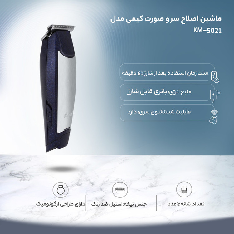ماشین اصلاح مدل km-5021 ساخت شرکت کیمی، تیغه های این ماشین اصلاح از استیل ضد زنگ ساخته شده است که در مقابل هوا و رطوبت از مقاومت خیلی بالایی برخودار است. تکنولوژی برش این ماشین اصلاح بصورت مستقیم می باشد و به راحتی موها را با مرزبندی مشخصی کوتاه می کند. سری اصلی این ماشین اصلاح موهای سر وصورت را از 0.5 تا 2.5 سانتی متر واسه ی شما کوتاه می کند. به همراه این ماشین اصلاح سه عدد شانه ارایه شده است و می توان از آن ها برای کوتاه کردن مو و سایه انداختن استفاده کرد. باتری ماشین اصلاح کیمی مدل km-5021 در مدت 8 ساعت بطور کامل شارژ می شود بعد از شارژ کامل دستگاه می توان از آن به مدت 60 دقیقه پیوسته استفاده کرد. همچنین به همراه این ماشین اصلاح روغن و برس ارایه شده است تا شما بتوانید پس از هر بار اصلاح تیغه را به خوبی تمیز و مرتب کرد